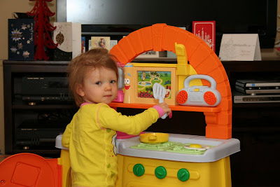 The kitchen came with plastic food, plates, silverware, etc. The minute she got a hold of the spoon and fork, she HAD to test them out! She wanted breakfast right then (in the middle of opening gifts) so that she could eat with her new toy fork/spoon.