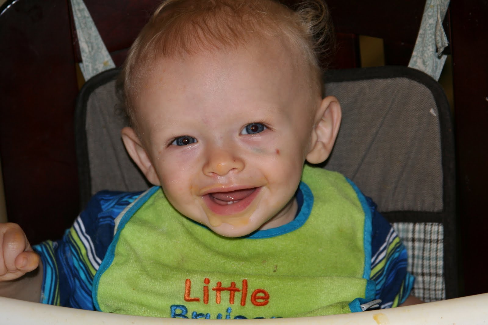 Miles with his first shiner! He fell at Aha's house and hit his left eye on the corner of the coffee table. Bless his heart! It was just coincidence that his bib says, "Little Bruiser".